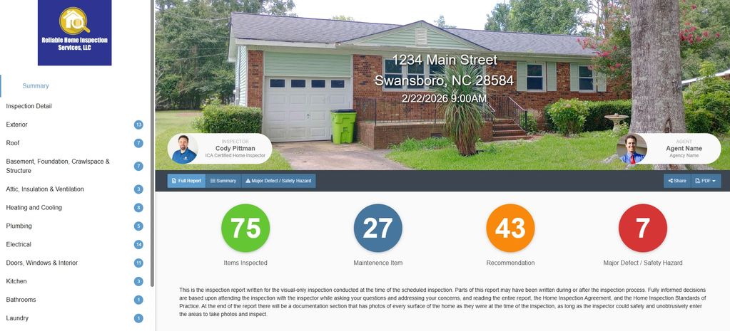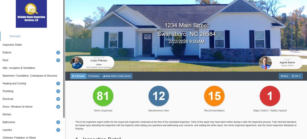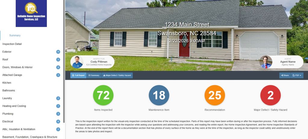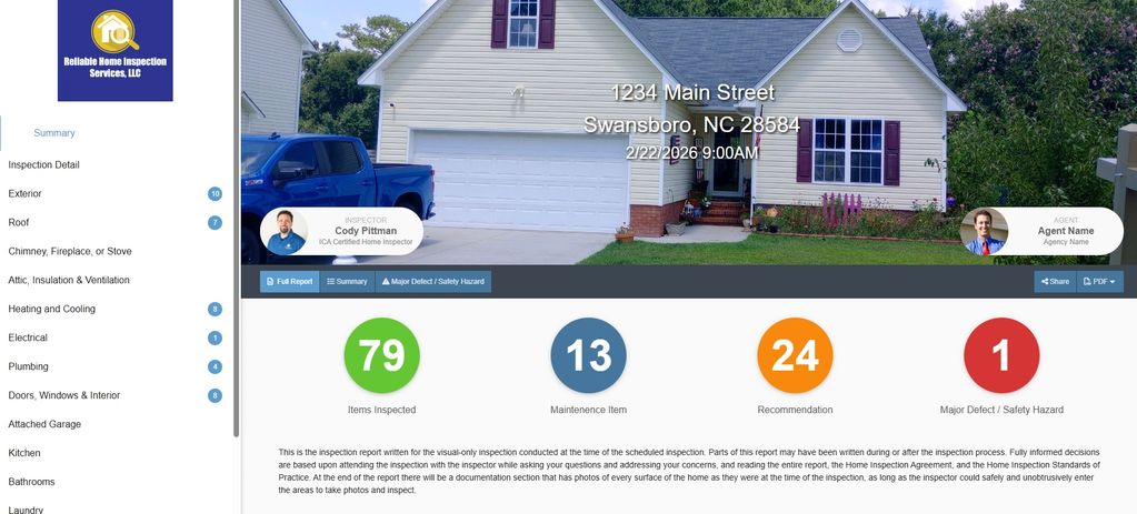 At Reliable Home Inspection Services LLC, your licensed home inspector in Fayetteville, NC Our reports are created with Spectora, one of the most sophisticated report softwares available to home inspectors. Our reports are easy to read, include detailed descriptions and photos, provide recommendations for repairs and maintenance, and are very user friendly. You will always have access to an online report that easy to navigate and can easily download or print a PDF copy.